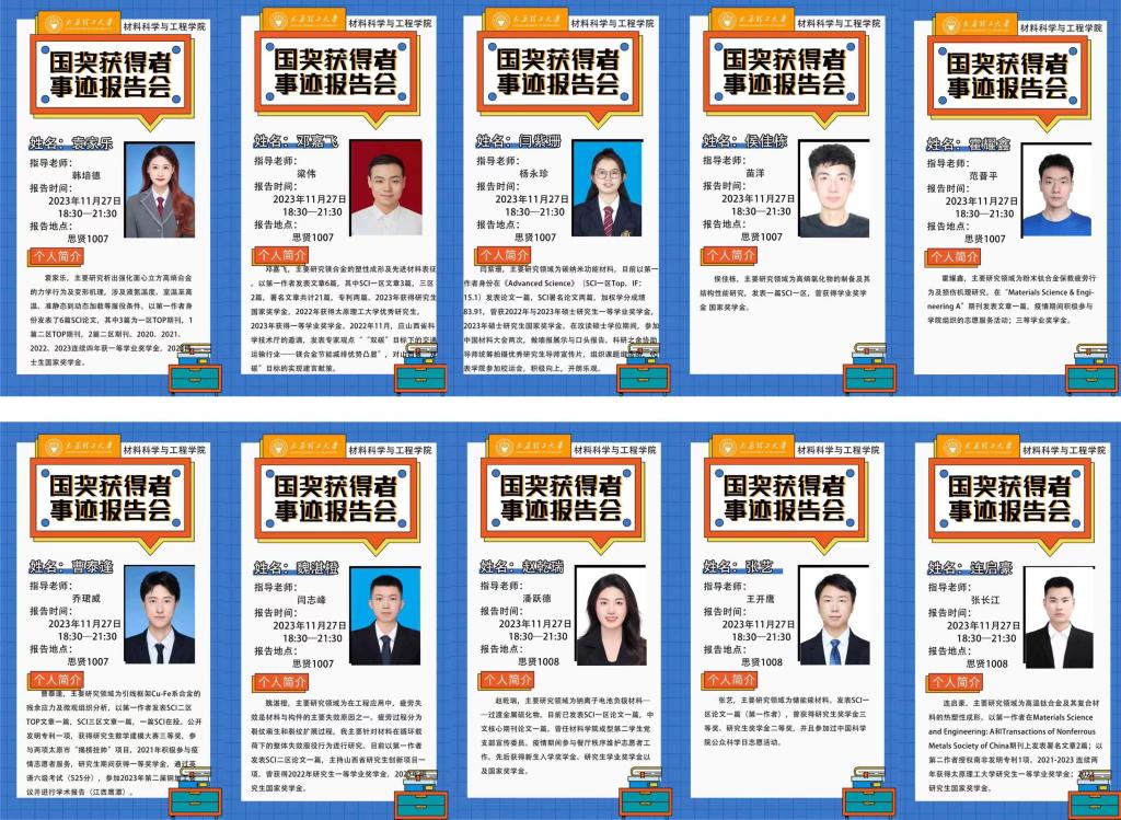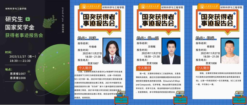 本次研究生国家奖学金获得者事迹报告会的成功举办,不仅充分展示了M88官方网站研究生在学术研究领域的卓越成果,为公司人才培养注入了新的活力,更是拉近了榜样与同学们之间的距离,为同学们在生活和学习中遇到的问题提供了可参考的成功经验。望全体材料学子以优秀学子为榜样,不忘初心,砥砺奋进,为科技强国贡献属于太理人的青春力量!