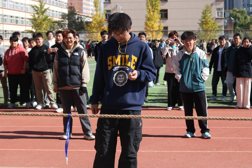 比赛现场气氛紧张而热烈。各组参赛队员积极准备,跃跃欲试。伴随着队长们整齐划一的口号声,观赛同学们热情高涨的加油声、欢呼声此起彼伏,队员们紧握长绳,脚抵着脚,卯足了劲拼命往后拉。
