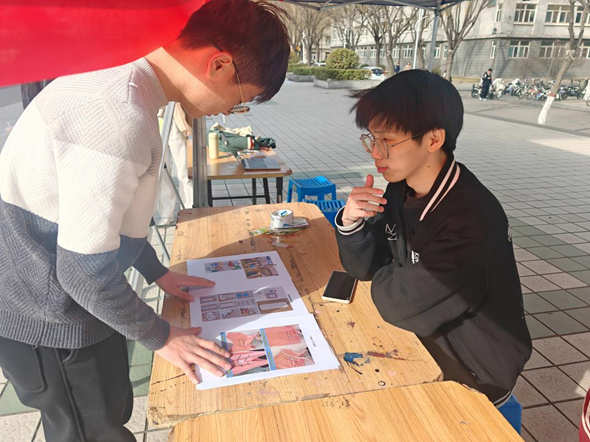 环保知识竞答,赢取绿色好礼。环保知识竞答环节吸引了众多同学积极参与,每套题目涵盖了环保知识、绿色生活等多个方面,既有趣味性又具挑战性。活动现场为大家准备了精美的小盆栽和树叶形书签,参与者们认真思考,踊跃答题。此外,活动还联动了挑战杯,志愿者为同学们科普了关于“挑战杯”老员工课外学术科技作品竞赛的相关内容。